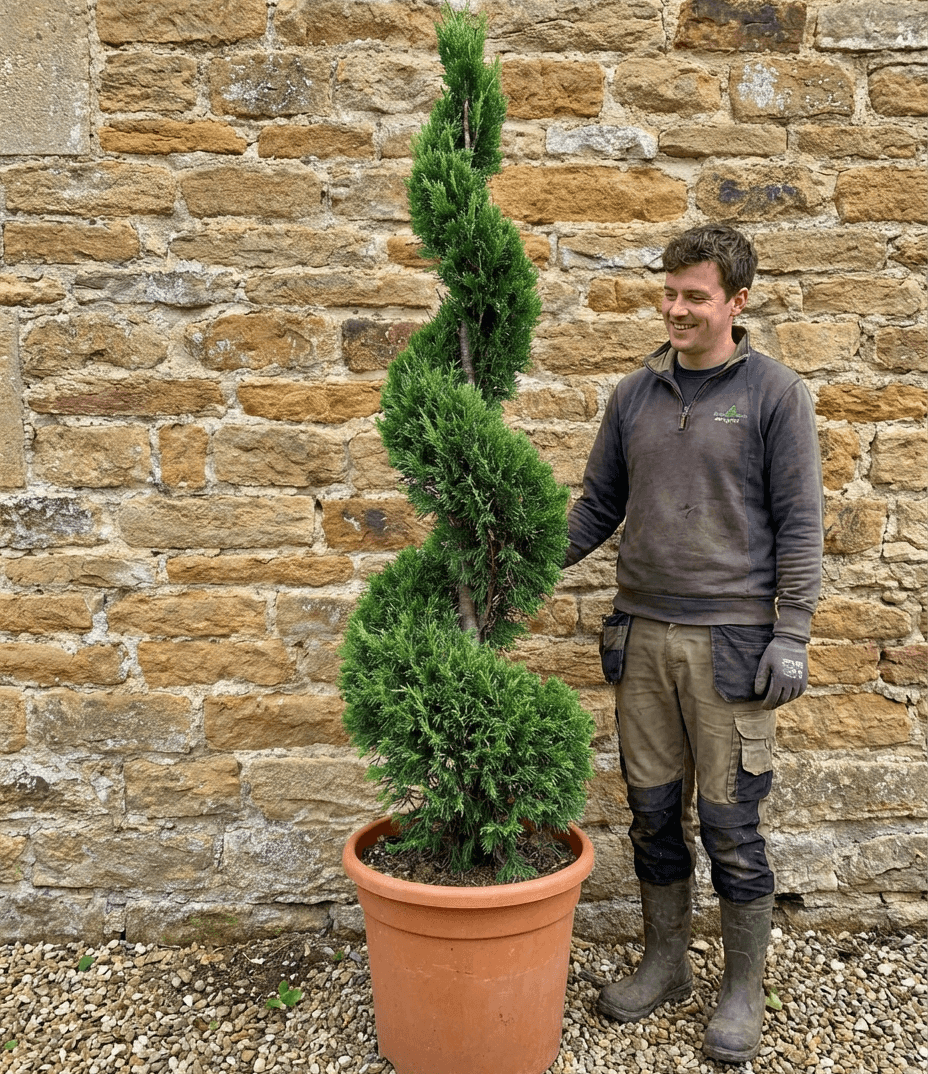 The Thuja OC Smaragd Spiral is a wonderful plant which offers structure and elegance to the garden in which planted. This tree with its spiral form is ornamental throughout the wodding year. It is adaptable to normal soils, clay soil and even chalk soils. When grown outdoors, the tree does well either in full sun, semi-shade or more exposed environments. Pretty easy to care for, the Thuja OC Smaragd Spiral has an expected growth rate of 20 – 40 cm per annum and can be pruned down to a height between 1 – 4 meters.